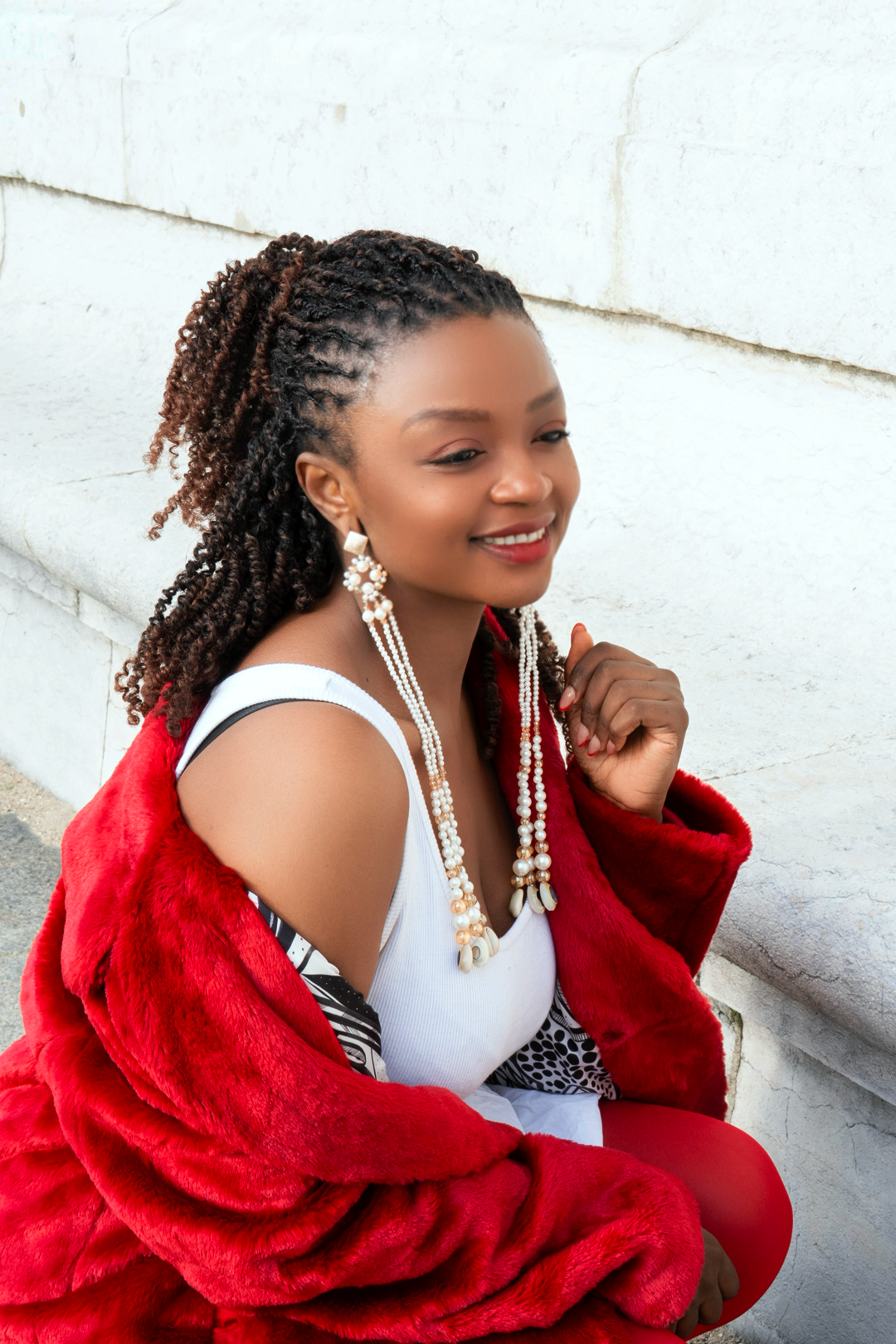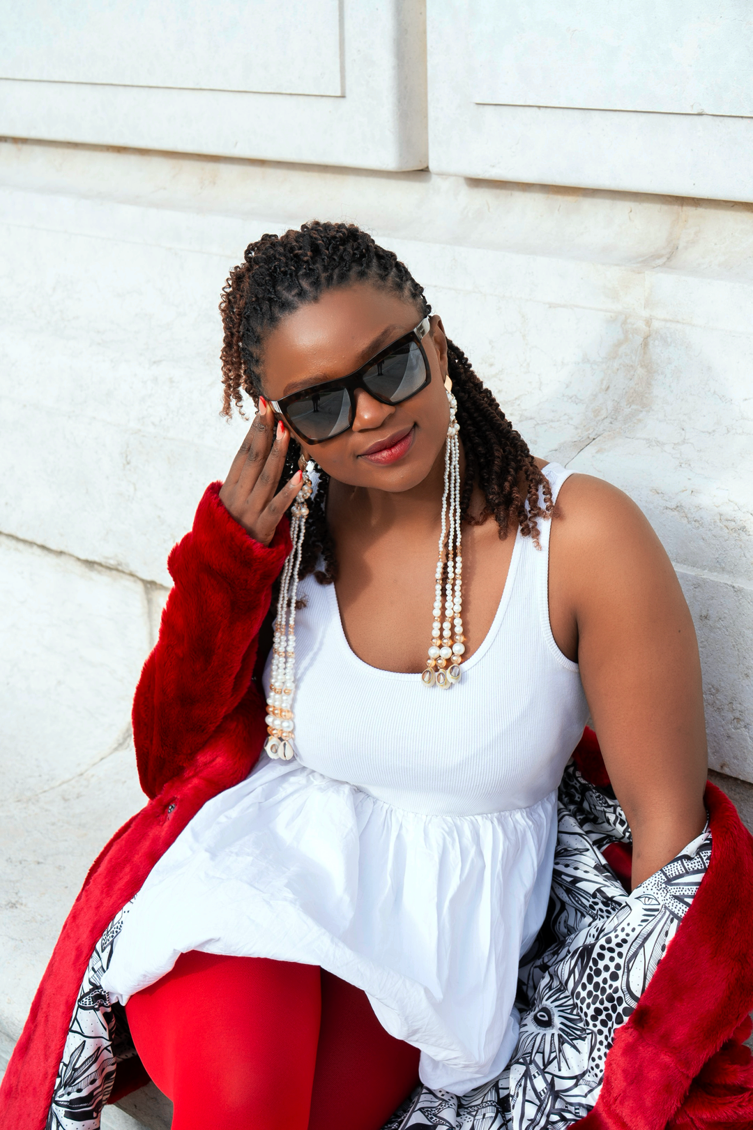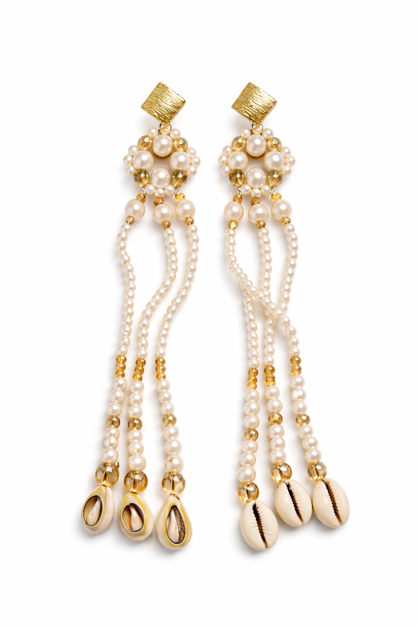 Composées de perles nacrées finement assemblées, de perles translucides aux reflets dorés et de six cauris naturels, ces boucles d’oreilles dessinent un mouvement fluide et hypnotique à chaque pas.